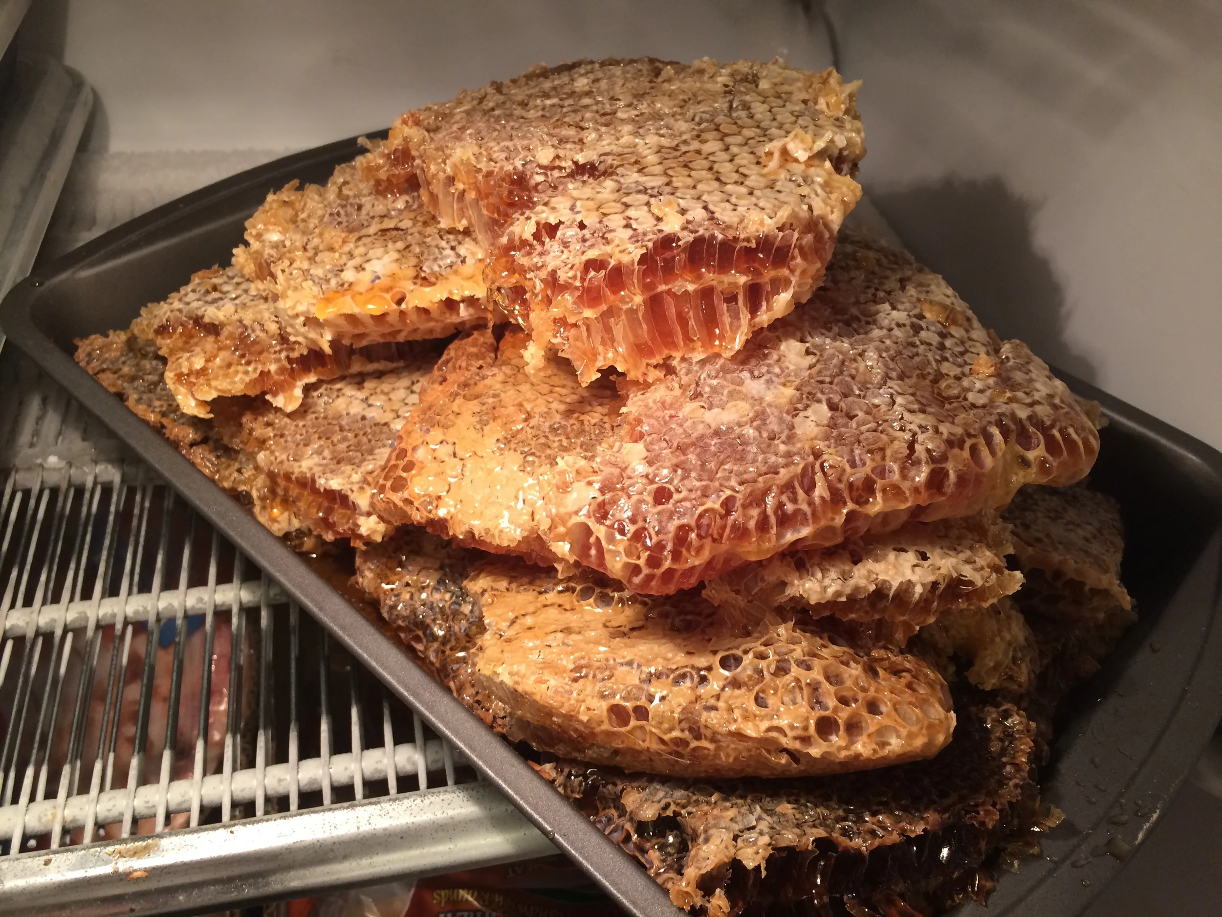 Random Chunk Comb Honey - I have random size chunks of comb honey. This can be cut to a specific weight or random, and is sold by the net weight. Comb honey is best consumed (in my opinion) by taking a spoon full of honey and comb and eating it all at once. Work the honey out, and then the beeswax can be chewed like gum for some time thereafter. The wax can be swallowed with no hard to your system. Or spit it in the trash. Or keep it and melt it down (though you'll have to eat a lot of honey to make a candle!)